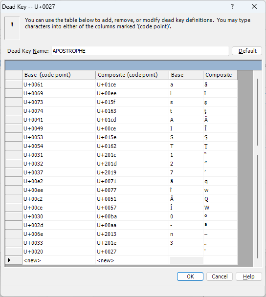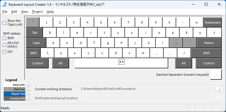 デッドキー[:][`]には、Takiに出現するその他の特殊文字を一通り仕込んでおく。例えば、一部の文章では[ă]の代わりに[ã]や[ǎ]が用いられている。