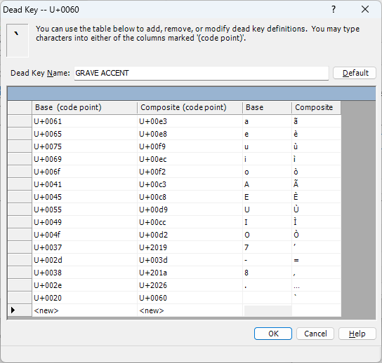 デッドキー[^]には、サーカムフレックスと[ç]を仕込む。[`]には、グレイブ、[ä][ë]以外のウムラウト、[ß]、およびTakiに出現するその他の特殊文字を仕込んでおく。[:]には[é]を配置したため、デッドキーとして使えないことに注意する。